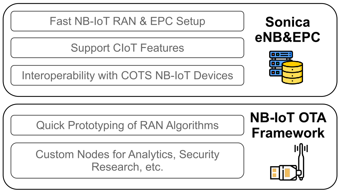 Sonica (Software-defined Open NB-IoT Research Platform) provides an open-source NB-IoT testbed that is able to communicate with commodity off-the-shelf (COTS) devices.